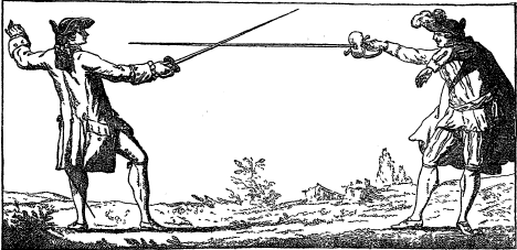 Хотя эта стойка для итальянцев естественна, все же они меняют ее ежеминутно, чтобы озадачить противника, и держат запястье и острие клинка высоко на линии плеча; или держат запястье высоко, а острие клинка очень низко и делают широкие жесты и поворачивают вокруг противника иногда направо, а иногда налево, или резко ступают левой ногой направо; и колют прямые уколы наобум или делают шаги и вольты. Они очень полагаются на свою ловкость и защиту левой рукой; потому, когда дерутся два итальянца, они часто поражают друг друга одновременно, что называется контруколом. Между опытными фехтовальщиками такое случается редко, потому что они знают, как найти клинок удвоенным переводом или кругом, и потому что быстро уходят с выпада.