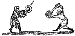 Рис. 7. Бой на мечах и щитах. Из рукописи в Королевской библиотеке