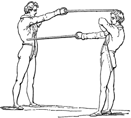 Для этого весьма своеобразного упражнения требовались в основном сила и гибкое запястье, от которого очень быстро наносили все удары, так чтобы как можно реже и меньше нарушать стойку; а также быстрая реакция – самые успешные попадания получались либо на финт противника, либо на удар по левому боку с целью заставить опустить левую руку; и наконец, большая осторожность и выдержка, которые позволяли дерущемуся не упустить верное время для удара по голове противника, не открывая при этом собственную и не обращая внимания на многочисленные удары по локтю или ребрам [207] .