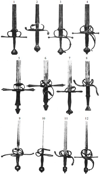 1. Английская рапира (с насечкой), последняя четверть XVI века. Вид снаружи, концы крестовины загнуты в противоположные стороны, дужка, pas d'^ane и симметричные щитки, соединенные контргардами с дужкой. Клинок с долом, обоюдоострый, на пяте неглубокая выемка.