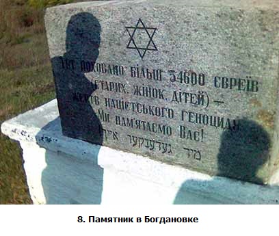Теперь возле выстраданного Гидалевичем памятника местная жительница рассказывает приезжим: "В Богдановку пригоняли тысячи евреев. В свинарники, а оттуда гнали на расстрел к оврагу. Мы, дети, издали наблюдали из-за кустов. Расстреляют группу, кричат "вбылы" ("убили") и новую партию стреляют. Детей, женщин. Они стояли шеренгой на краю обрыва и падали вниз с высоты. Там внизу их сразу сжигали. Перед расстрелом раздевали. Наши хлопцы на тых вещах разбогатилы, уихали п'oтим (уехали потом) в Одессу, там квартиры покупов'aлы (купили).