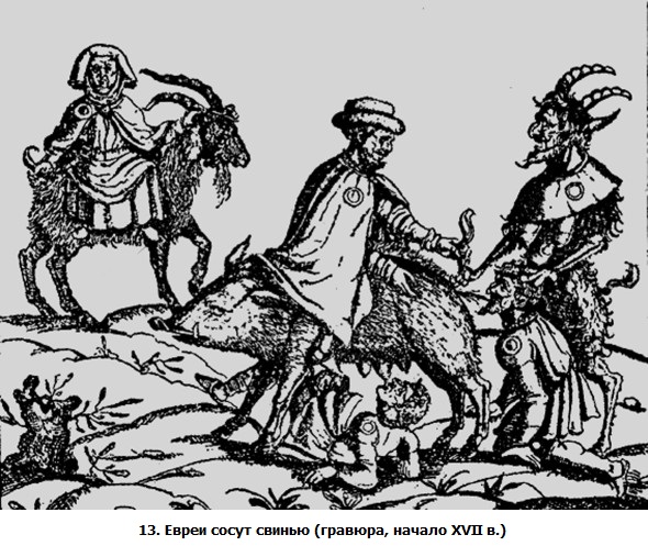 О евреях, конечно, не забывали: драма на европейской сцене да без еврейских ролей? Вождь Реформации Мартин Лютер с любезным народному сердцу изяществом стиля втолковывал: " Дьявол помочился и опорожнил желудок - эти вещи и есть подлинная святыня для евреев... – целовать, пожирать, лакать и поклоняться; в свою очередь, и Дьявол жрёт и лакает то, что эти его добрые ученики выплёвывают и извергают сверху и снизу" [25, 222].