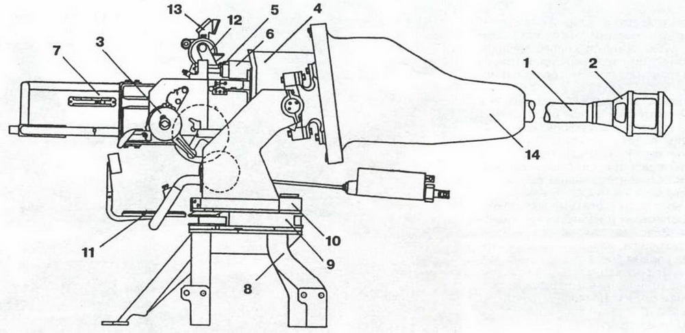 1 — ствол; 2 — дульный тормоз; 3 — механизм полуавтоматики; 4 — люлька; 5 — тормоз отката; 6 — накатник; 7 — ограждение пушки; 8 — станина; 9 — нижний станок; 10 — верхний станок; 11 — сиденье наводчика; 12 — корзинка прицела; 13 — прицел; 14 — маска пушки