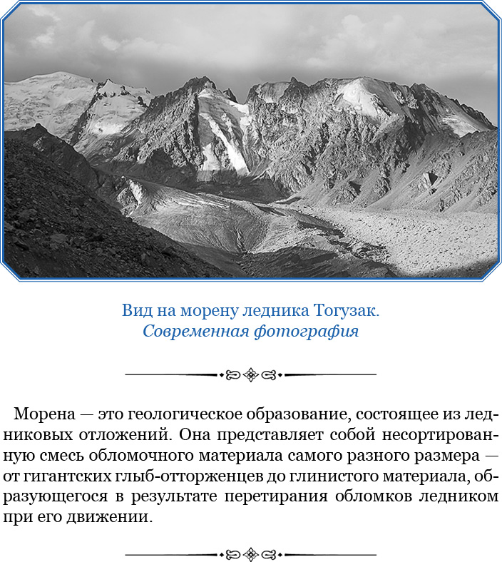 Это строение подставок как будто указывает и на строение льда в самом теле ледника на этом месте, вызываемое, может быть, нажимом с боков. Много ручьев бежит по оконечности ледника; в средней плоской части их менее; самый большой ручей течет параллельно средней морене, сопровождая ее с восточной стороны; он вырыл во льду рытвину до аршина ширины, которая в нижней части ледника не столько расширяется, сколько становится глубже; близ конечной морены рытвина имеет более сажени глубины, бока ее искривляются и вместо отвесных и прямых стен, образуют сводообразные и пещерообразные углубления, через которые ручей проносится с глухим ревом; достигнув конечной морены, он еще с большею стремительностью низвергается с нее в долину, внезапно из чистого источника превращаясь в мутный. Другой, но значительно меньший ручей, сбегает в долину в восточной части конечной морены.