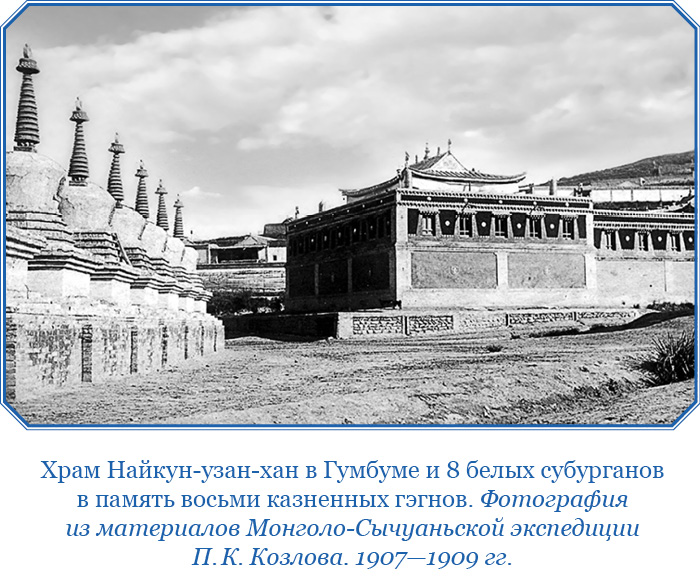 Гумбум, который китайцы называют Тар-сы, – один из важнейших монастырей северной группы амдоских монастырей, расположенных на северном берегу Желтой реки. К этой группе причисляются, кроме Гумбума: 1) Серку, по-китайски Гоман-сы, по-монгольски Алтын-суме, «Золотой храм»; 2) Орголын; 3) Чуйцзан (у Пржевальского – Чэйбсэн) и 4) Шячун. В южной группе (к югу от Желтой реки) более других знамениты: Уруньву, Лабран и Джони.