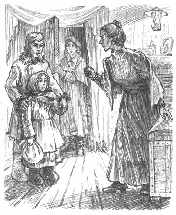 Сердитый человек с колодкой пошел вперед, ворча себе под нос что-то. Дети последовали за ним. Они переступили какой-то порог, где их охватил запах кислой капусты и какой-то затхлости. Несмотря на густые клубы дыма и чада, дети увидели, что они находились в чьей-то грязной кухне. Здесь хлопотала у плиты какая-то женщина. Двое ребятишек держались за ее подол. В углу кухни, сидя в поленьях, два дюжих парня трудились над сапожной работой.