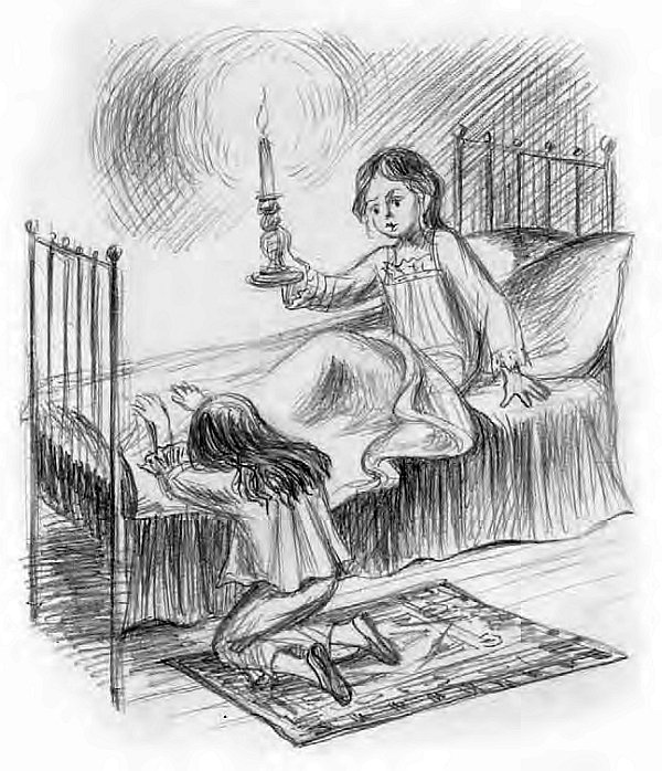 Ответа нет. Только прежнее громкое всхлипывание звучит где-то близко, близко! Я чиркаю спичкой… Зажигаю свечу, находившуюся всегда на ночном столике у моей постели, и, высоко подняв ее над головою, разом освещаю комнату.