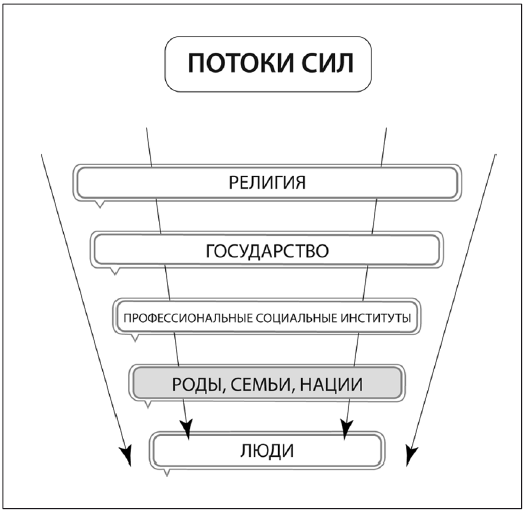 Новая эгрегориальная структура сместила роды и семьи на более низкую иерархическую позицию, и теперь они подчиняются уже непосредственно государству через большое количество структур и систем. На них влияют профессиональные или социальные институты, которые являются продолжением государственной власти. Та, в свою очередь, невзирая на всю «светскость» законов, подчинена правилам и догматам доминирующей религиозной структуры.