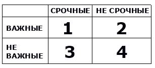 ••• Эффективные люди уменьшают размер квадрата [1], затрачивая больше времени на квадрат [2]. А от действий в квадратах [3] и [4] вообще стараются отказаться, т. к. эти квадраты содержат не важные дела (пусть даже и срочные).
