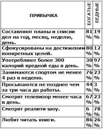 Том Корли (автор популярной книги «Привычки богатых людей») и Дэйв Рамсей (финансовый консультант) заметили, что богатые и бедные люди имеют совершенно разные привычки.