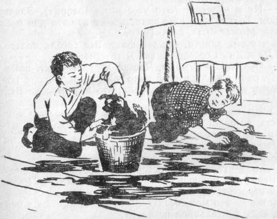 Взяли мы зверюгу за шиворот и бац! — в ведро. Зверюга ка-ак завизжит! А потом как выскочит из ведра — и наутёк. А брызги и грязь так и летят в разные стороны. Мы — за ней, она — в коридор, мы — в коридор, она — на кухню. А на кухне — только я хотел зверюгу схватить — она бух в ящик с золой. Для кошки был ящик.