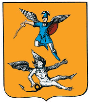 При Ф. Санти видоизменена была и эмблема города Архангельска, представленная на петровских знаменах в виде всадника на крылатом коне, поражающего копьем змея. Теперь она получила несколько иной вид, видимо, из-за нежелания повторять московскую эмблему (всадник, поражающий копьем дракона), а также известную по Титулярнику 1672 года эмблему грузинских и карталинских князей. Ф. Санти изобразил Архангела в синем одеянии, с огненным мечом и щитом в золотом поле, внизу которого – поверженный черный дьявол. Можно сказать, что в данной композиции яснее, чем в предшествующем изображении, подчеркнута взаимосвязь эмблемы с именем города: Архангел – Архангельск.