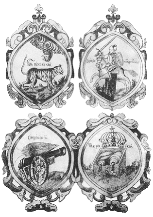 Знаки, олицетворяющие город, все больше входили в жизнь русского общества, и не только в связи с самими городами. Так, вновь формирующиеся полки обязательно назывались по имени города, а на их знамени должен был изображаться его герб. Заказы на такие эмблемы поступали в Герольдмейстерскую контору из Военной коллегии.