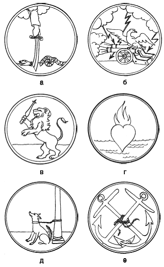 Чем обусловлен выбор именно данных эмблем из помещенных в книге более чем 800 номеров? Возможно, какую-то роль сыграли девизы (аллегорические надписи), сопровождавшие каждый рисунок книги. Выбирались такие девизы, общий тон которых соответствовал идеям, пропагандируемым Петром I. К примеру, белгородскую эмблему (лев, а над ним – петух), в которой петух заменен орлом, сопровождают фразы: «Приключая и сильнейшему трясение», «Приехал, видел, победил». В последующих аллегорических изображениях (фейерверках, украшениях триумфальных ворот и шествий) лев всегда олицетворял Швецию, над которой берет верх русский орел. К эмблеме для знамен Тобольского полка (оружейная пирамида со знаменами и барабаном) относится изречение: «Труды мои превозвысят мя»; к эмблеме, предназначенной для воронежских полков (орел,