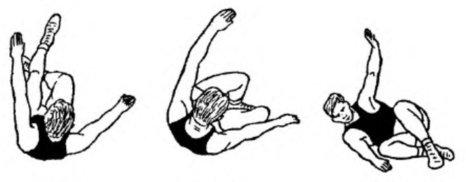Падение на бок из положения приседа. Принять положение полного приседа, прижав подбородок к груди и вытянув руки вперед. Из этого положения сесть на ковер правой ягодицей возможно ближе к правой пятке и, не прерывая движения, сделать перекат по правому боку и падение на правый бок.