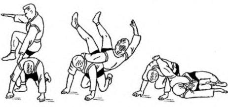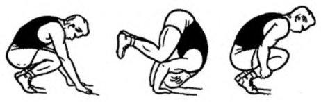 Из положения приседа. Принять положение приседа, прижав подбородок к груди и вытянув руки вперед. Из этого положения сесть на ковер как можно ближе к пяткам и, не останавливая движения, сделать перекат на спину. Заканчивать падение ударом рук о ковер. Сделать тот же перекат на спину, вытягивая руки вперед-вверх.