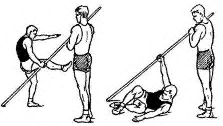 7. Падение на бок через палку. Партнер держит палку двумя руками, следя за тем, чтобы она не коснулась его ключицы. Встать к палке спиной так, чтобы партнер был справа. Левый подколенный сгиб прислонить к палке, а правой рукой захватить ее снизу возле правого бедра. Левую руку и правую ногу вытянуть вперед, прижав подбородок к груди (рис. 17). Согнуть спину и, крепко держась правой рукой за палку, начать падение, следя за положением падающего туловища. Левая рука должна обогнать движение туловища и всей поверхностью с силой ударить по ковру. В последний момент перед падением следует подтянуться правой рукой к палке, что еще больше смягчит падение (рис. 18). Проделать аналогичное падение через палку на правый бок.