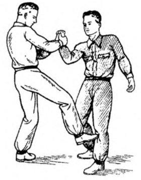 Противник упадет на землю в полуобморочном или обморочном состоянии от удара в промежность и со значительным повреждением связок левого плечевого сустава.
