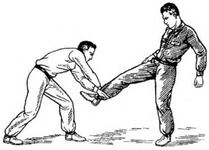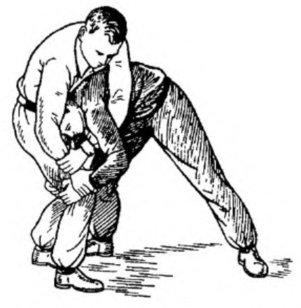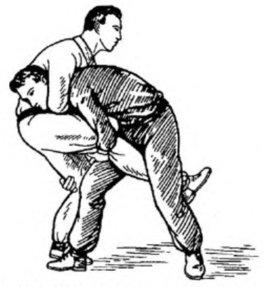 оптимальным для развития этих качеств является занятие спортивной борьбой. Можно много распространяться о целесообразности регулярных занятий спортивной борьбой и о ее применении. Предоставим вам самим в этом убедиться, проанализировав попарно рисунки, на которых показано применение спортивных приемов (рис. 401 и 403) и их аналогов в экстремальной ситуации (рис. 402 и 404).Рис. 401. Бросок отхватом в спорте.