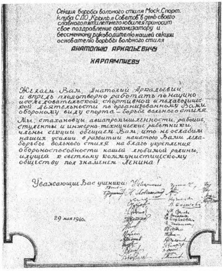 Фрагмент адреса от учеников Анатолия Харлампиева в день пятилетия секции. Подписи: Неведомский, Чумаков, Будзинский, Хованский, Чухров, Андреев, Сазонов, Орлова, Борисова, Никольская, Латышев, Сазонов, Васюков, Хохлачёв и др.