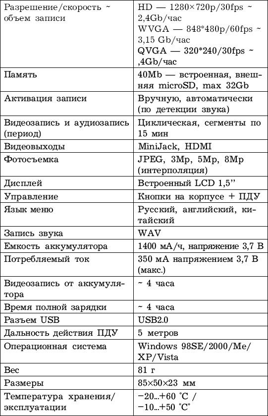 На дополнительную карту памяти microSD (до 32 Гб) благодаря компрессии H.264 помещается 45–60 минут видео-аудиозаписи в режиме 1280x720/30fps (см. табл. 2.1).