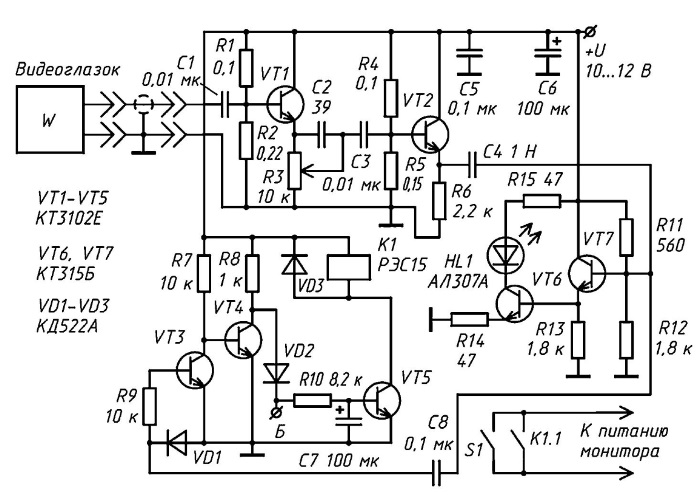 Видеодетектор на транзисторах VT3-VT5 управляет реле и монитором в зависимости от видеосигнала на входе (точка А).