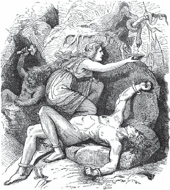 Наказанный Локи и его супруга Сигюн. Иллюстрация XIX в. к «Старшей Эдде».