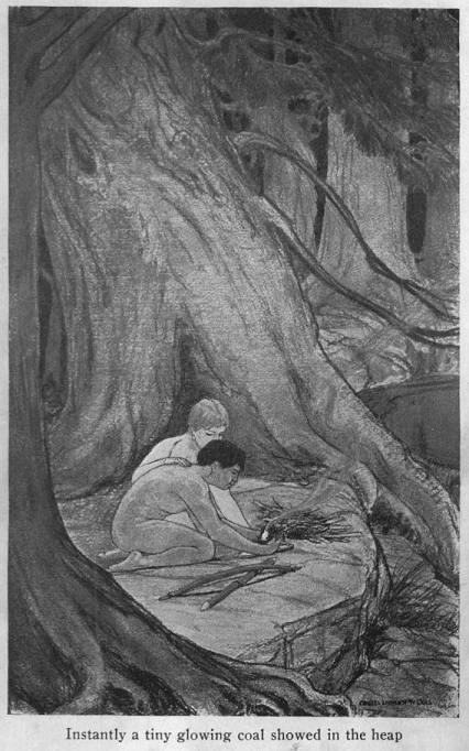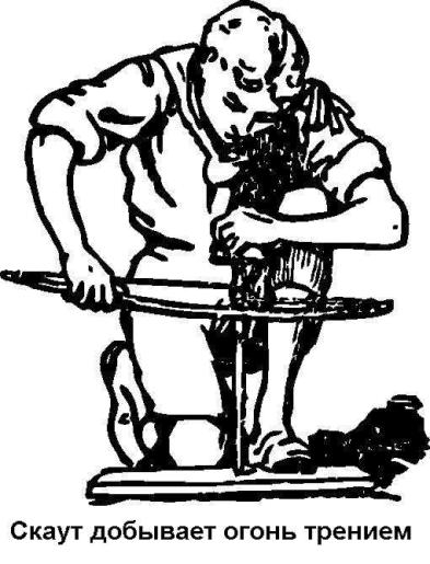 Затем Джо принялся нагнувшись бродить вдоль речки, высматривая что-то; наконец он нашёл ещё один кусок кремня с острой кромкой. Используя два увесистых булыжника как молот и наковальню, Джо принялся обкалывать найденный кремень, и наконец добился того, что получилось грубое рубило с широким краем, за который его можно было держать. Над ручьём росла высокая бальзамическая пихта, один из корней которой вылез из берегового обрыва и засох. Джо ухватился за него, потянул изо всех сил и сумел отломать длинную и плоскую щепу. Своим кремнёвым рубилом он проделал в деревяшке углубление в полдюйма шириной и в три четверти дюйма глубиной [34] . На конце этой канавки, под углом, он с некоторым трудом при помощи первого осколка кремня, которым он надрезал кору, проковырял дырку; затем, вновь пользуясь рубилом, отделил от сухого корня новую щепу — в полтора фута длиной и чуть меньше дюйма толщиной [35] . Эту деревяшку Джо строгал, тёр и выглаживал своими грубыми инструментами, пока на обоих её концах не получилось что-то вроде длинных карандашей. Это было сверло для добывания огня. Теперь один конец этого приспособления Джо вставил в проделанное в деревяшке отверстия, а второй — в маленький кусок дерева с углублением. После этого Джо сломал сухую, но прочную ветку, согнул её в короткий, не более двух футов, лук, и, сделав зарубки по оба его конца, привязал, со слабиной, плетёную лыковую тетиву. Уилл в это время, следуя указаниям Джо, собирал хворост. Отрезав кое-как несколько довольно крупных, сухих туевых щепок, он колотил их камнем на камне, пока не вышла куча тонких, ломаных лучинок. Часть их он завернул в кусок сухой туевой коры. После этого он оторвал кусок берёсты, которая, как известно, горит не хуже промасленной бумаги, и осторожно изорвал её в мелкие, тонкие клочки. Когда всё было готово, Джо обернул лыковой тетивой зажигательное сверло, выбрав всю слабину, поставил ногу на нижнюю деревяшку, а левую руку — на верхнюю, плотно прижал зажигательное сверло к углублению в нижней и принялся размеренными сильными движениями двигать лук вперёд и назад на всю длину. Сверло, вращаясь поочерёдно вправо и влево, постепенно углублялось в деревяшку. Джо постепенно увеличивал скорость движений, не теряя, однако, ритма и не позволяя сверлу останавливаться ни на секунду. По мере того, как твёрдое сверло крутилось туда-сюда, бурая древесная пыль сыпалась в углубление вокруг сверла. Сверло вращалось всё быстрее и быстрее; труха постепенно чернела, и от неё начал подниматься дымок. Ещё несколько быстрых движений — и Джо вдруг нагнулся и подул на курящуюся кучку трухи. Тот час же в почерневшей кучке показался тлеющий огонёк. Юный индеец взял у Уилла щепоть тоненьких, как нитки, лучинок, поднёс к искорке и снова принялся старательно дуть — и наконец сухие древесные волокна вспыхнули. На этот, пока ещё слабый огонёк Джо положил кусочки берёсты, затем сухие веточки горного лавра [36] , устроив что-то вроде крохотного шалаша — и вскоре Огонь, древнейший друг человека, встал между мальчиками и древнейшими людскими врагами — холодом и тьмой. На склоне рос белый ясень [37] , несколько толстых нижних сучьев были мёртвыми и высохшими. Уилл, повиснув на них и раскачиваясь, сумел их сломать, а потом при помощи камня разделил на поленья. Ещё пять минут — и жаркое, ясное пламя с гулом по