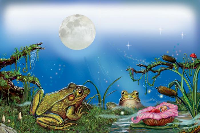 Раз ночью, когда Дюймовочка лежала в своей колыбельке, через разбитое оконное стекло пролезла большущая, мокрая, безобразная жаба! Она вспрыгнула на стол, где под розовым лепестком спала Дюймовочка.