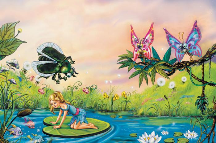 Маленькие рыбки, которые плавали под водой, столпились у стебля, на котором держался лист, перегрызли его зубами, и листок с девочкой поплыл по течению.
