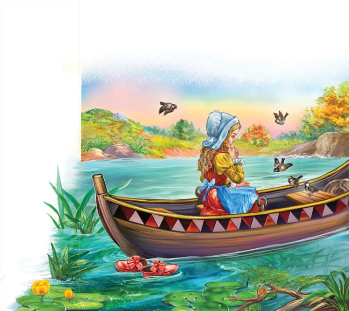 Лодку уносило всё дальше. Герда сидела смирно, в одних чулках: красные башмачки её плыли за лодкой, но не могли догнать её.