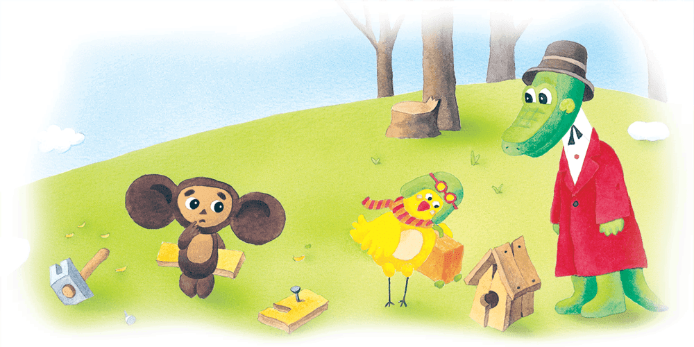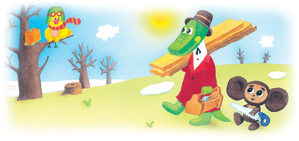 Приближалась весна. Одна птичка уже прилетела. Гена и Чебурашка решили сделать скворечники. Они достали пилу, доски, гвозди и принялись за дело.