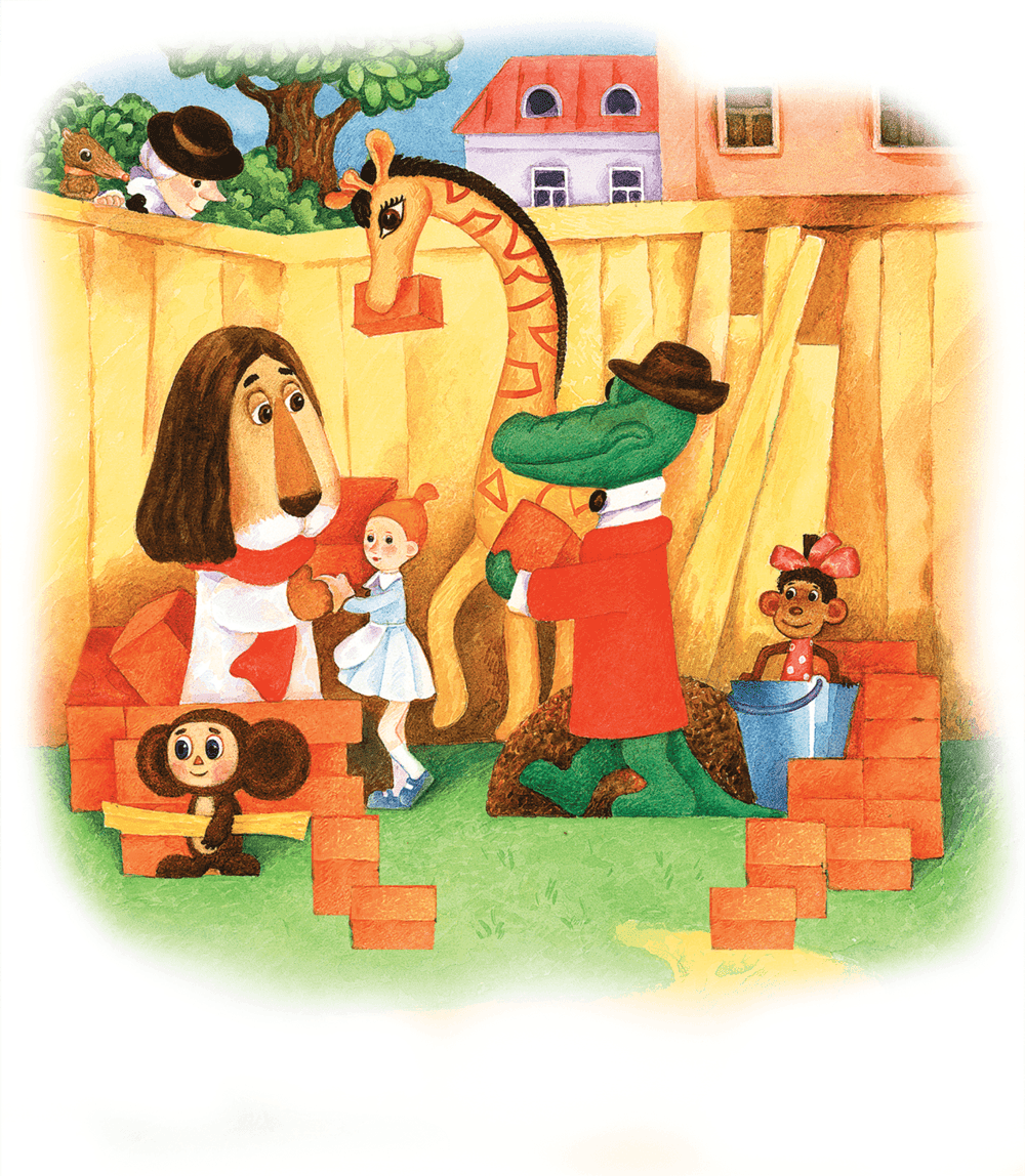 И тогда звери и дети решили построить Дом дружбы, в который каждый сможет прийти и подобрать себе друга. Жирафа стала работать подъёмным краном, Чебурашка – заготовителем стройматериалов, а все остальные сделались строителями.