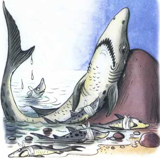 А рядом прикорнулаЗубастая акула,Зубастая акулаНа солнышке лежит.Ах, у её малюток,У бедных акулят,Уже двенадцать сутокЗубки болят!