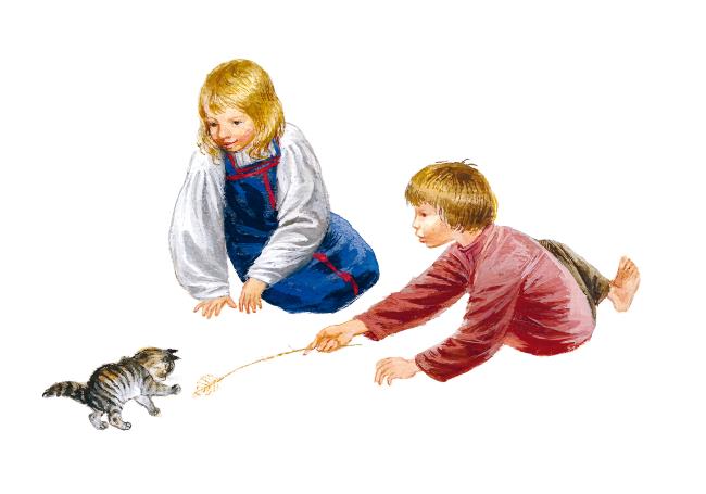 Были брат и сестра – Вася и Катя; и у них была кошка. Весной кошка пропала. Дети искали её везде, но не могли найти. Один раз они играли подле амбара и услыхали, над головой что-то мяучит тонкими голосами. Вася влез по лестнице под крышу амбара. А Катя стояла внизу и всё спрашивала: «Нашёл? Нашёл?» Но Вася не отвечал ей. Наконец, Вася закричал ей: «Нашёл! наша кошка… и у неё котята; такие чудесные; иди сюда скорее». Катя побежала домой, достала молока и принесла кошке.