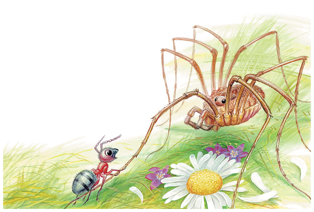 Пришлось Муравьишке по паучьей ноге вверх лезть до коленки, а с коленки вниз спускаться Пауку на спину: коленки у Сенокосца торчат выше спины.
