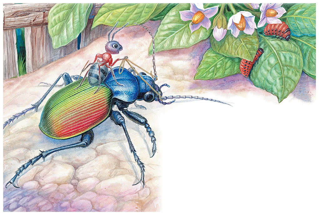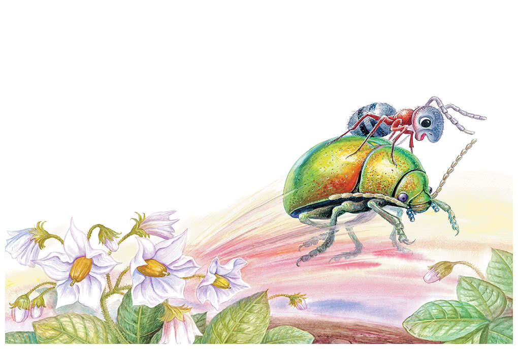 Только успел Муравьишка вскарабкаться Жужелице на спину, она как пустится бежать! Ноги у неё ровные, как у коня.