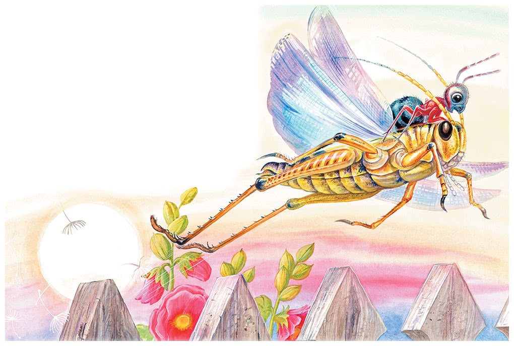 Кузнечик сложил свои длинные задние ноги пополам, потом разом выпрямил их и подскочил высоко в воздух, как Блошачок. Но тут с треском развернулись у него за спиной крылья, перенесли Кузнечика через забор и тихонько опустили на землю.