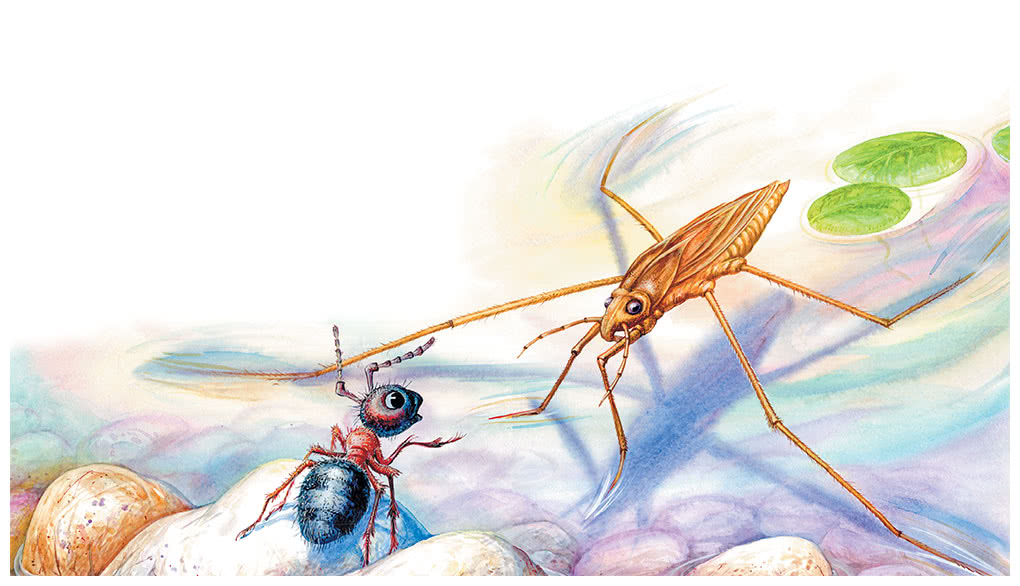 – Через реку и мне не перескочить: очень уж широкая. Стой-ка, я Водомерку кликну: будет тебе перевозчик.