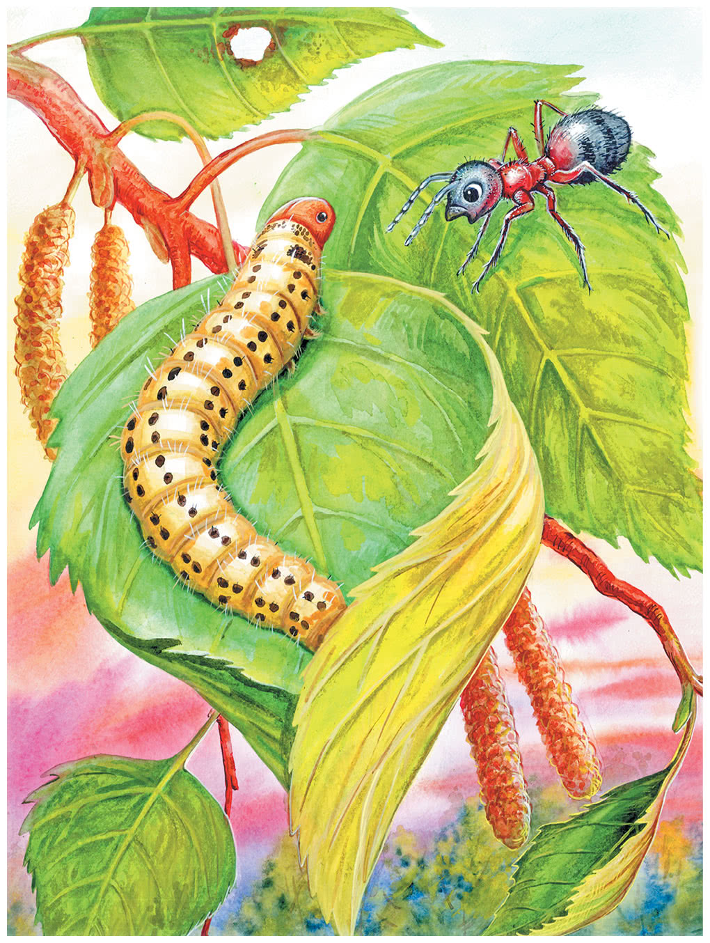 Вдруг видит: рядом на листке Гусеница-Листовёртка сидит, шёлковую нитку из себя тянет, тянет и на сучок мотает.