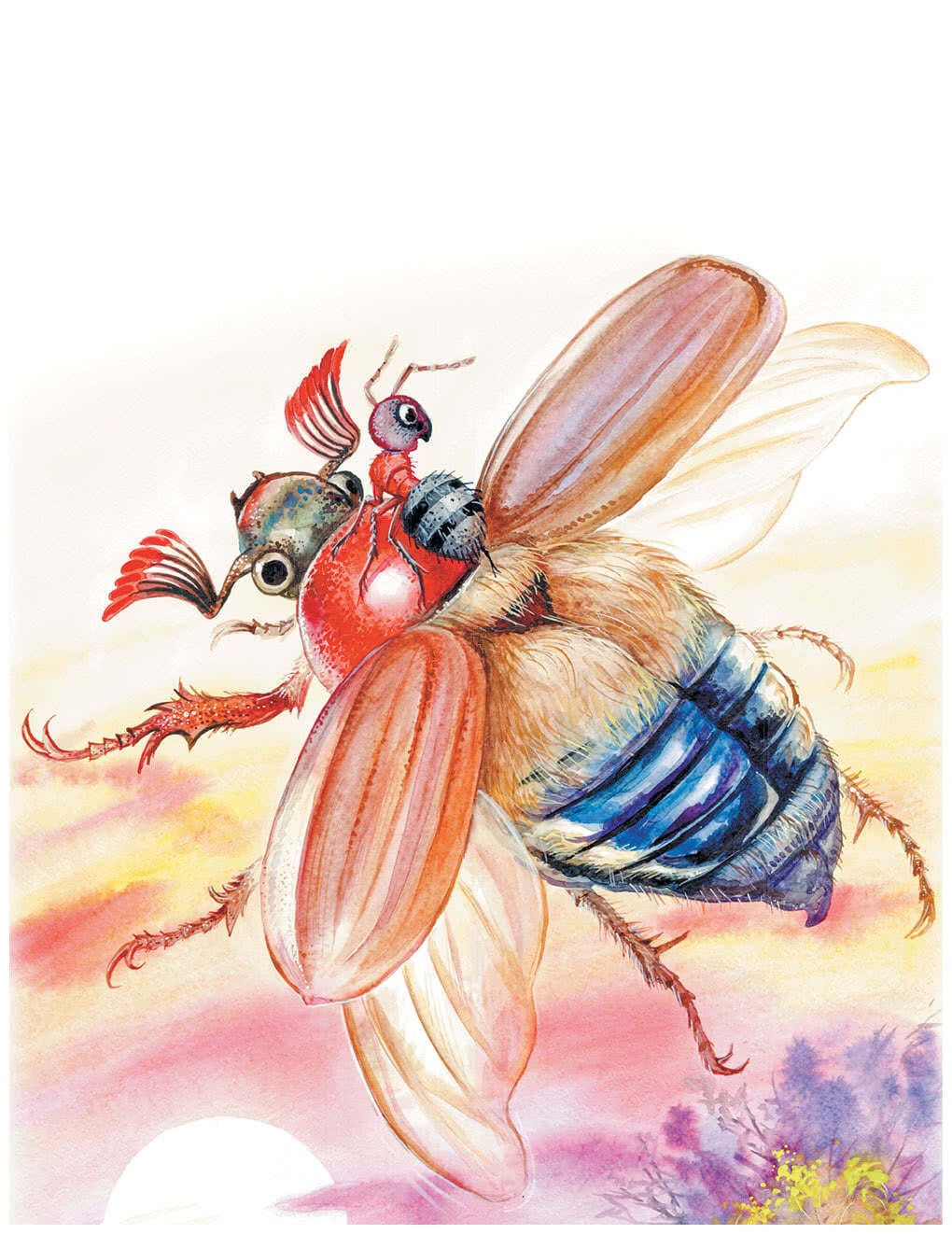 Влез Муравьишка Жуку на голову. И хорошо, что не остался на спине: разломил Жук спину надвое, два жёстких крыла приподнял. Крылья у Жука точно два перевёрнутых корыта, а из-под них другие крылышки лезут, разворачиваются: тоненькие, прозрачные, шире и длиннее верхних.