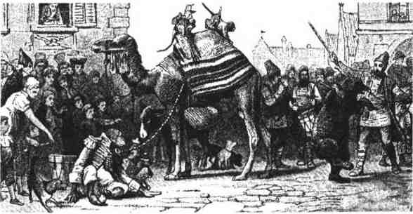 Но однажды случилось, что в город пришли какие-то люди с невиданными животными. Это был неизвестно откуда пришедший сброд, имеющий верблюда, который умел кланяться, медведя, который танцевал, и нескольких собак и обезьян, которые в человеческих платьях имели довольно комичный вид и выделывали разные штуки. Обыкновенно эти люди проходят по городу, останавливаются на перекрестках и площадях, поднимают на маленьком барабане и флейте неблагозвучную музыку, заставляют свою труппу танцевать и прыгать, а