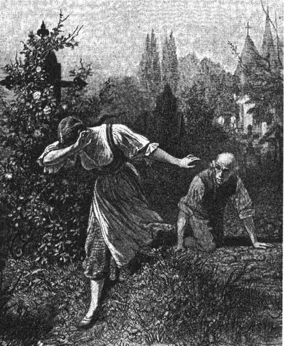 Она перешла через несколько известных ей могильных холмов, но чем ближе стала подходить к белым розам на могиле Кетхен и к могиле страшного торговца, тем ей делалось все страшнее и страшнее. Наконец она была там. Дрожа, она опустилась на колени и начала рэать розы. Вдруг ей показалось, что совсем близко она слышит какой-то шорох. Она оглянулась: в двух шагах от нее из одной могилы вылетала земля и оттуда медленно поднималась какая-то фигура. Это был старый бледный человек. Сестра перепугалась. Она взглянула еще раз, чтобы убедиться, действительно ли она видит это. Когда же стоявший в могиле гнусавым голосом проговорил: «Добрый вечер, девушка! Откуда ты так поздно?», ее охватил смертельный ужас.