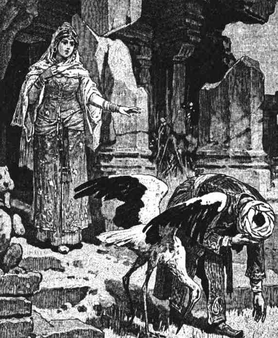 А затем он обернулся к востоку. Аисты трижды склонили свои длинные шеи навстречу солнцу, которое только что поднималось за горами. «Мутабор!» — воскликнули они и вмиг превратились в людей. В великои радости от вновь дарованной жизни государь и слуга смеясь и плача обнимали друг друга. Но кто опишет их изумление, когда они оглянулись? Перед ними стояла прекрасная, великолепно наряженная дама. Она с улыбкой подала калифу руку.