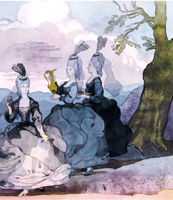 Феи наклонились над юношей, который всё ещё не приходил в себя, и увидели, как он красив. Они решили рассказать о нём своей повелительнице, Царице Ночи: это были её придворные дамы.