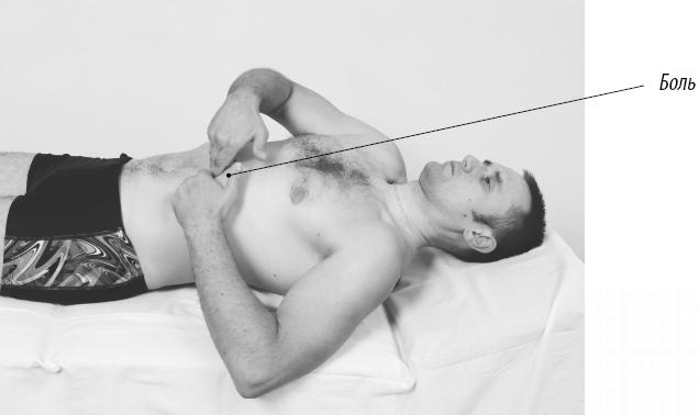 Упражнение 4.15. Диагностика опущенного желудка. Тест II Сядьте на кушетку, слегка согнувшись в грудном отделе позвоночника. Во время выдоха медленно нагните грудной отдел позвоночника вперед, затем правой рукой обхватите лучезапястный сустав левой руки. Тут же сожмите левую руку в кулак, поставьте его под правую реберную дугу и нащупайте под кожей довольно плотную ткань желудка.