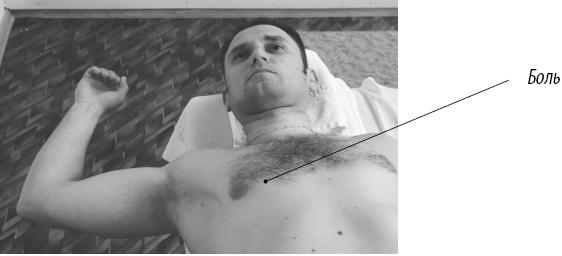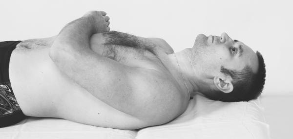 Теперь выполните упражнение для расслабления малой грудной мышцы с левой стороны. Для этого перелягте на левый край кушетки.