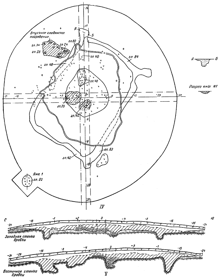 Как уже говорилось выше, размеры и форма этой ямы, ее местоположение и несколько более архаичный облик керамики дали основание предположить здесь грунтовое захоронение, впоследствии попавшее под курганную насыпь. Таким образом, в кургане I было три типа захоронений: одно, более раннее, — в грунтовой могиле, второе — обычное захоронение под курганной насыпью и третье, более позднее — впускное — в верхней части насыпи.