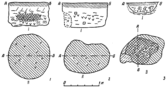 Грунтовые погребения совершались в ямах круглых или овальных в плане, размером от 80 см до 1 м. В разрезе форма их очень устойчива и сводится в основном к двум типам — прямоугольной и полукруглой (рис. 5). Ямы располагались на расстоянии 1–4 м одна от другой. Глубина их колебалась от 40 до 60 см. Так как площадь могильника вскрыта только частично, сейчас пока трудно говорить о какой-либо закономерности в их расположении и судить о планировке грунтового могильника, но следует отметить, что на вскрытой площади ни одна яма не перерезала другую и во вскрытых траншеях они располагались по линии запад-восток. Заполнение грунтовых могил очень единообразно. Как правило, погребальный комплекс состоял из угля и золы в заполнении ямы, кальцинированных костей и нескольких фрагментов керамики, лежавших вместе с костями. Если кости и черепки лежали на дне ямы, то дно было обожжено, угли и зола лежали там же, если же кости и керамика лежали выше, в заполнении ямы, то углистые и золистые прослойки находятся над и под ними. В некоторых ямах кальцинированных костей было очень мало. Встречено несколько ям без костей, но там под фрагментами керамики прослеживался слой сажи. Как правило, черепки принадлежат нескольким (обычно двум или трем) разным сосудам; но в тех случаях, когда положены только фрагменты стенок, бывает затруднительно это определить, так как керамика однообразна. Черепки часто носят следы пребывания в огне. Иногда они лежат поверх засыпки ямы. Никаких других предметов или костей животных в ямах не встречено, за исключением тех случаев, когда в яме «Г» (траншея 8) вместе с кальцинированными костями лежали обожженные зерна гороха, в ямке «Д» (траншея 8) вместе с костями было обнаружено обожженное пряслице и в яме 4 (траншея 8) найдены обломок ножа и бусина.