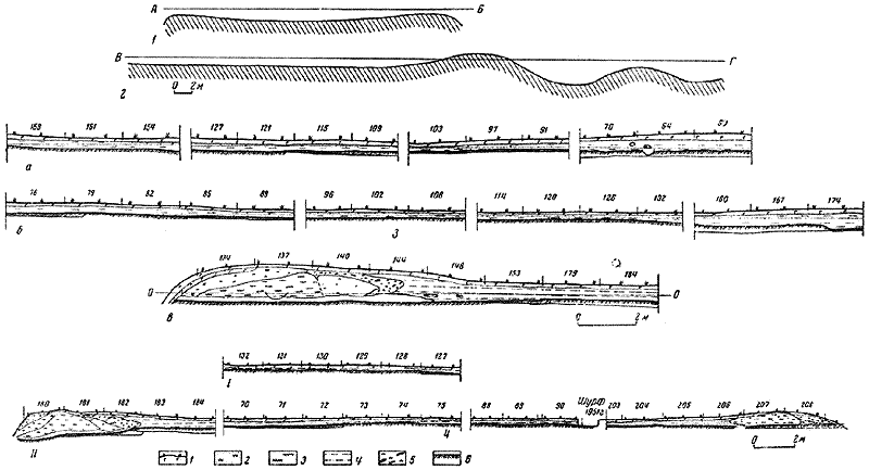 I — южный; II — северный (1 — почвенный покров; 2 — прожженный песок; 3 — зола; 4 — супесь; 5 — уголь; 6 — материк).